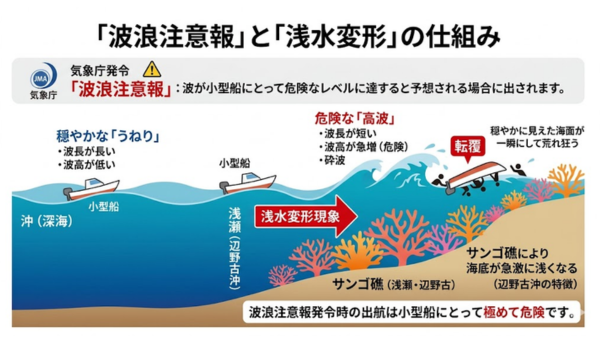 出航時点で付近には波浪注意報が発令されており、これがこの事故を語る上で最も重要な前提です。