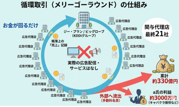 実際の広告配信やサービス提供はほとんどなく、お金だけが複数の会社の間を行き来することで「売上があった」という帳簿上の記録が生まれます。
