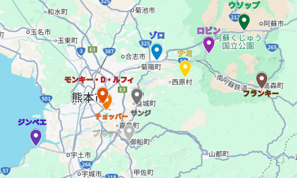 熊本県民にはすっかりお馴染みになり、「県庁にはルフィがいて~」「動物園にはチョッパーがいるよね~」などと場所とキャラクターが完全一致します。