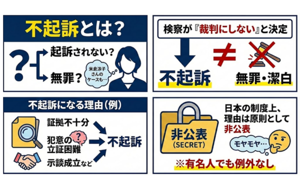 - 不起訴の理由は非公表だが、証拠不十分などが背景と見られる